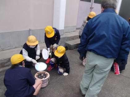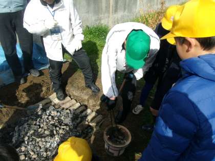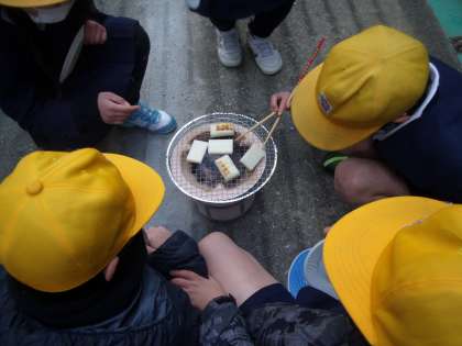 地域の方の協力を得て、朝から炭に着火してから使いました。子どもたちは、炭をもらい、七輪で火おこしをしました。初めての体験で火おこしに苦戦していましたが、火が起きるとうれしそうな表情を浮かべていました。また、火が起きると、網をのせ、餅を焼く体験もしました。少し焦げた餅もありましたが、自分たちが苦労して焼いた餅をおいしそうに食べていました。
