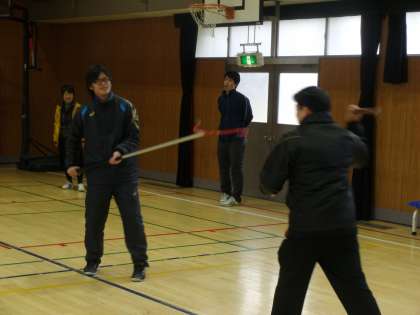 また、子どもたちが下校後さすまたの使い方や不審者の対応の仕方、護身術等について教職員が研修として教えていただきました。