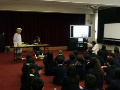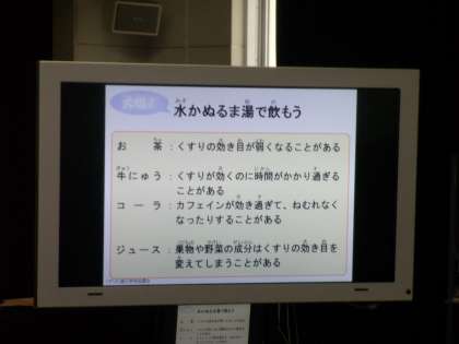 くすりについての話を、薬剤師の先生に教えていただきました。くすりを指示通りに飲まないと効き目が悪かったり、体に害になったりすることを知ることができました。また、水や茶、ジュース、それぞれで薬を溶かす実験もしました。