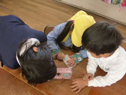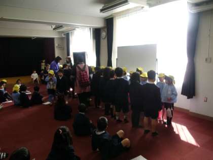 1年生の子どもたちが、保育所の年長の子どもたちと遊んだり、校内を案内したりしました。首からかける名札を用意して、保育所の子どもたちにプレゼントしました。1年生の子どもたちが、お姉さん・お兄さんとして接する姿が頼もしかったです。帰り際に保育所の子どもたちが、「楽しかった。」や「4月からここに入学するのがうれしい。」などと言っていました。