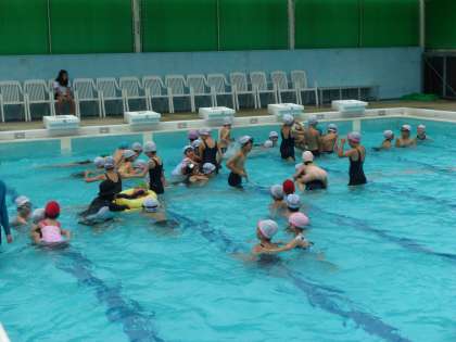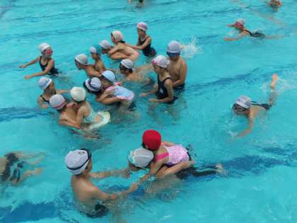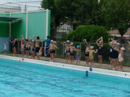 小学校のプールで、かわいい幼稚園の子どもたちと5年生のお兄さんや