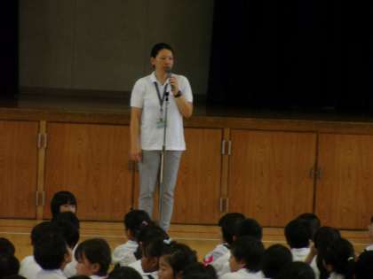 朝、講堂に集まって校長先生のお話しや生活指導の田中先生からも