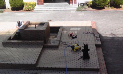 管理作業員さんが、噴水の中を掃除して、きれいにしています。 水がきれいなわけがわかりましたね。