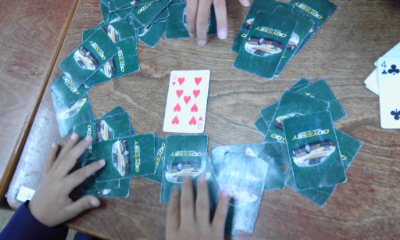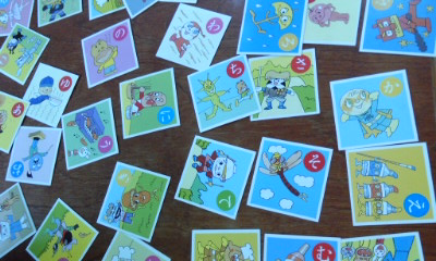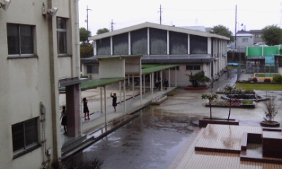 雨の日に、子どもたちは、教室で本を読んだり、かるたやトランプをして遊んでいました。高学年の子は、講堂から校舎への渡り廊下で、「ぐ・り・こ」をしていました。