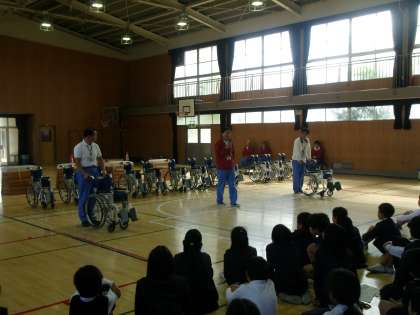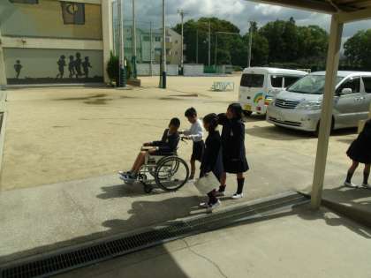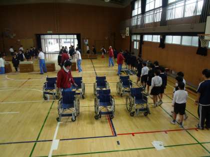 車いす体験の学習をしました。車いすの乗り方や降り方、押し方などを