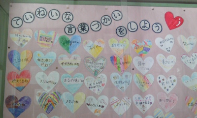 「ていねいなことばづかいをしよう」の掲示物が、玄関を入ったところにはってあります。人に言われてうれしい言葉を使いたいものです。