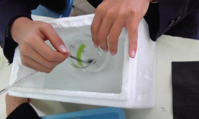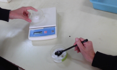 実験「30度の水50mlに溶けるミョウバンの量を調べよう。」ミョウバンの量をはかって、少しずつ溶かしていました。