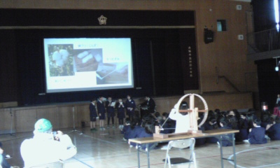 土曜授業で、3年生は、綿づくりを通して、わかったことや調べたことを発表しました。その後、地域の方や平野区わたの会の方と、綿繰り機・ゆみ・ぼう車を使って、綿を糸に紡ぎました。
