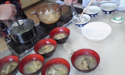 調理実習で、「ごはんとみそ汁」を作りました。にぼしのだしで作った味噌汁は、おいしかったですね。