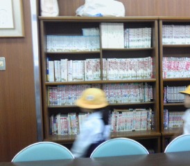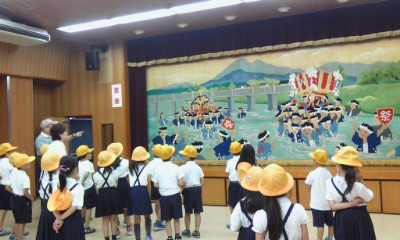 きょうは、「川辺会館」に行きました。大小の会議室や図書館がありました。一番大きな部屋には、祭りの絵が描かれた緞帳がありました。