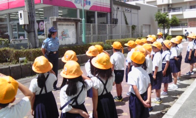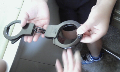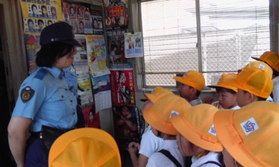交番の中で、お巡りさんの仕事を聞いたり、手錠や警察手帳も見せていただきました。