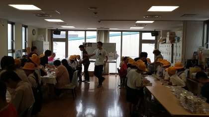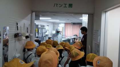 雨の中、行ってきました。一階には、パン工房があり、焼き上げる前の生地やプリンを見せてもらいました。2階では、包装の体験もさせていただき、作業が丁寧に早く正確にしなければならないことを、おしえてもらいました。三階では、網戸のサッシに使う道具の梱包の様子も見せていただきました。子どもたちの多くは、初めての作業を興味深く見学していました。見学の最後には、お土産のパンをもらいました。