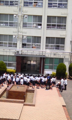 噴水のところに並んでとりました。3階にカメラマンがカメラを構えています。