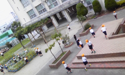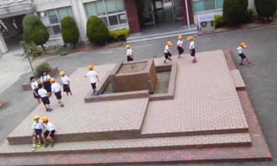 暑くなったので、噴水の周りには、子どもが集まります。朝顔やミニトマトも育っています。
