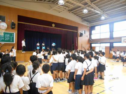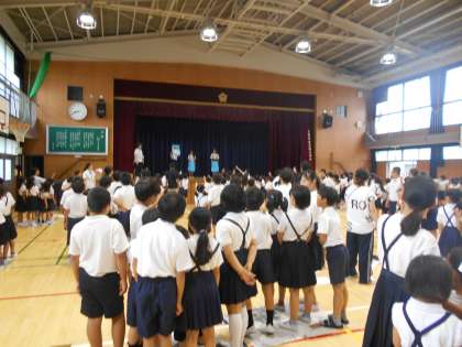 高学年の人が低学年の人をおんぶしたり、だっこしたり中には肩車をしてい