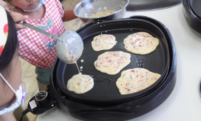 7/7(土)生涯学習の親子クッキングが行われました。栄養士の瀧本先生の「元気の出る朝食運動」のお話もありました。メニューは、「プチプチホットケーキ」「キャベツとわかめのサラダ」「大豆のスパニッシュオムレツ」「桜エビのミルクスープ」でした。子どもたちは、包丁を上手に使って作っていました。生涯学習のお手伝いしていただいたみなさん、ありがとうございました。
