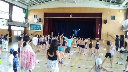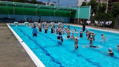 5年生の児童が、長吉幼稚園の園児さんと一緒にプールに入りました。入る前には、講堂で一緒に体操をして、年長さんは大プールで、年少さんは小プールで活動しました。園児のみんなに優しく接する5年生がたくましく見えました。