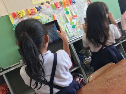 昨日、ベネッセのICT支援員さんに来ていただき、ICT機器を使った授業を行いました。4年生では、タブレットのカメラ機能を使って写真を撮ったり、撮った写真の名前をキーボードで入力したりしました。