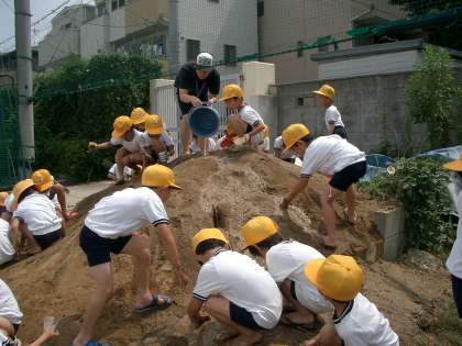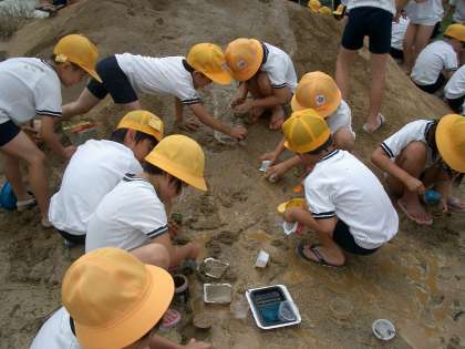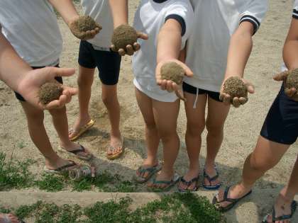 砂山から水を流し、砂が柔らかくなりどろ水がながれてきました。