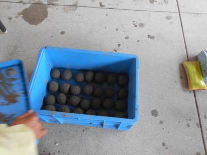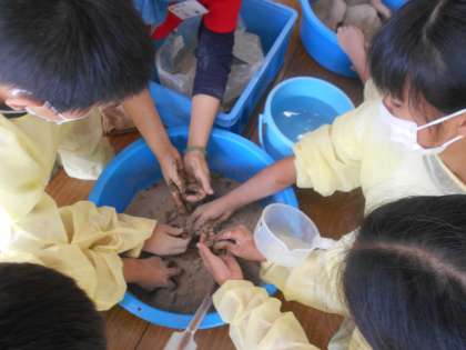 一生懸命に土を砕き水を入れて、土器の素材になる粘土玉を作りました。