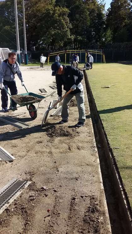 日曜日の早朝より地域の皆さんがしてくださいました。また、側溝にたまった土も出していただきました。芝も側溝もきれいになりました。