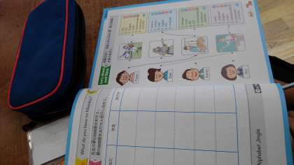 ケント先生の英語を聞きとり、言っていることをワークシートと結びつけています。