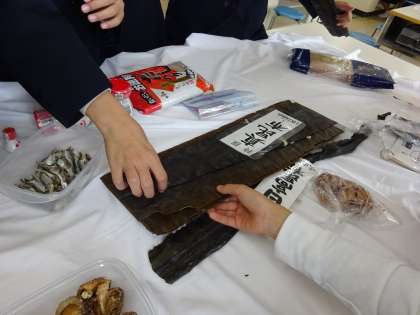 味の素の方にうまみ成分のことを教えていただきました。近年では、海外の方にも「UMAMI」と言えば通じるそうです。味にこだわる日本人が誇るべき文化の一つです。旨みを出す食材を実際見た子どもは驚きの表情を浮かべていました。子どもの中には、「鰹節の原料は?」、「家にある鰹節と違う。」など素朴な疑問をもち、現代社会が便利になった反面、身の回りから見なくなったものもたくさんあることに気づかされました。