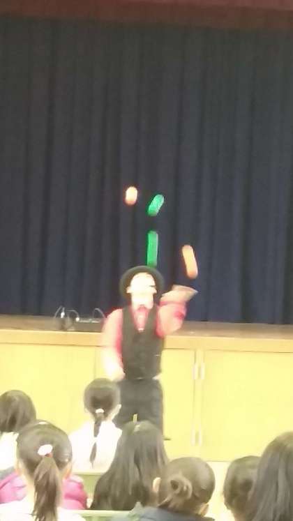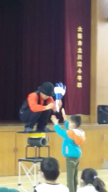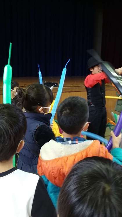 本校講堂にて、大道芸人ちゃいさんにパフォーマンスショーを見せていただきました。その後、バルーン教室をしていただきました。寒い日でしたが、大変盛り上がり、熱気を感じるイベントになりました。
