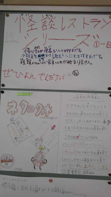 図書委員の人が図書室の廊下におすすめの本を紹介しています。