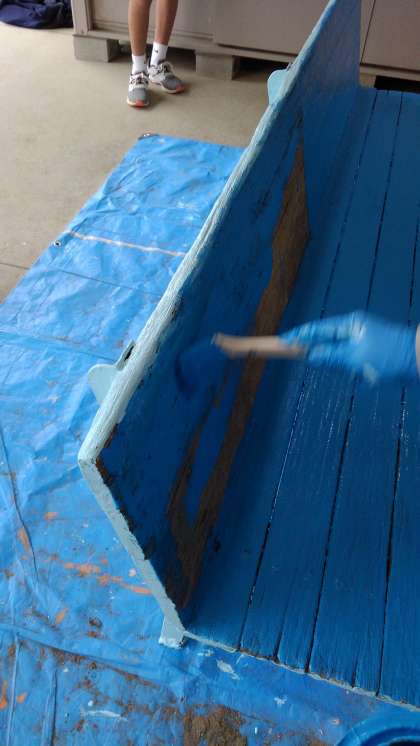 運動場にあるベンチにペンキを塗り、きれいにしています。出来上がりが楽しみです。
