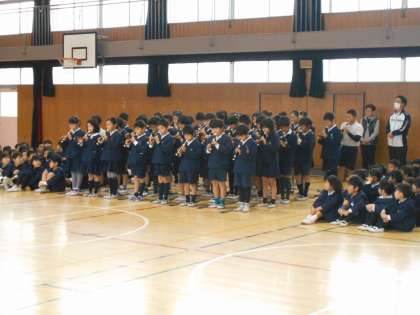 お礼に6年生からは、リコーダー演奏と雑巾の贈り物がありました。