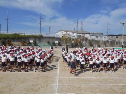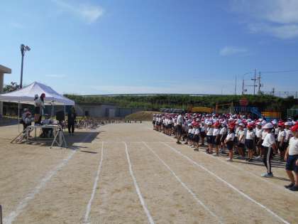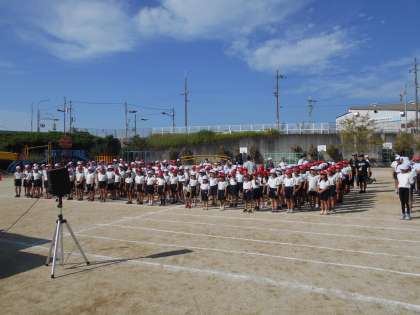 10月2日(木)の1時限目に、運動会の全体練習を行いました。晴天の下で、開会式と準備体操の練習を行いました。