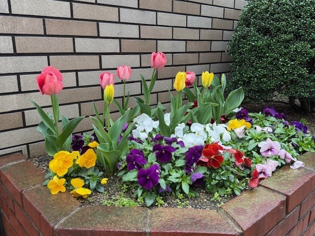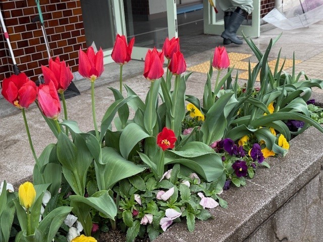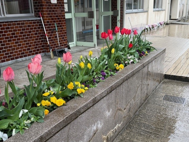 校内の花壇を紹介します。チューリップやパンジーがきれいに咲いています。
