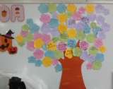後ろの黒板に「こころの木」を掲示しています。友達の良いところを見つけ、お花に書い...