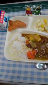 えびフライカレーライス、カリフラワーのピクルス、豆こんぶです。カレーライスには、...
