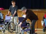 車いすの使い方について教えてもらいました。 その後、実際に押したり乗ったりして、...