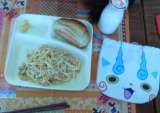 本年度、最後の給食です。メニューは、さけのクリームスパゲッティー・きゃべつとコー...