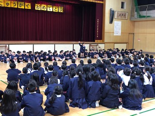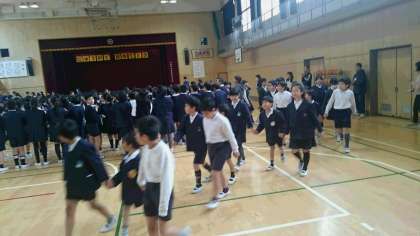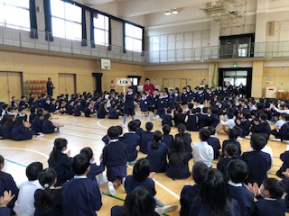 今日は、新1年生を迎える全校集会がありました。1年生は、みんなの前で元気に「はい!」とお返事ができました。それを聞いた2〜6年生からは自然と拍手が起こり、とても温かい雰囲気でした。代表委員会によるゲームも盛り上がりました。最後は、6年生のお兄さん、お姉さん、と一緒に校内巡りをしました。