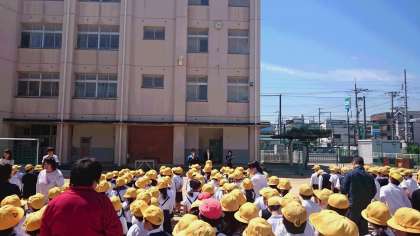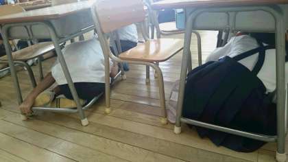 地震・津波を想定した避難訓練を行いました。大きな揺れが起こったことを想定し、机の下に隠れて身を守りました。その後、「お(おさない)か(かけない)し(しゃべらない)も(もどらない)」を守りながら、運動場に避難しました。最後は、津波が来ることを想定して、全児童が4階に避難しました。