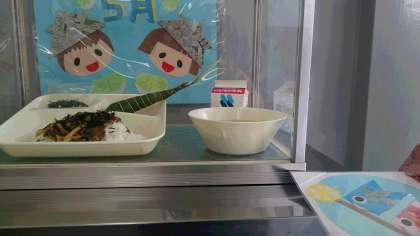 今日の給食は、「こどもの日の行事献立」です。牛肉のちらしずし、すまし汁、ちまき、牛乳です。ちまきは米の粉などで作った餅を笹の葉にくるみ、蒸して作ります。「こどもが元気で大きくなりますように」という願いをこめて食べます。