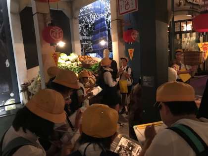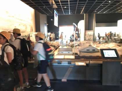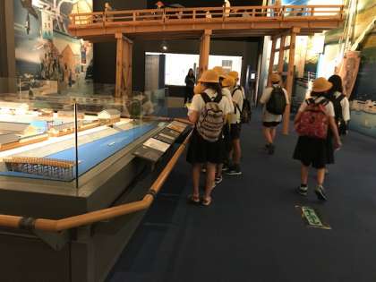 古代の難波宮や、江戸時代の文楽劇場などの模型を見て、当時の大阪の様子を学習しています。