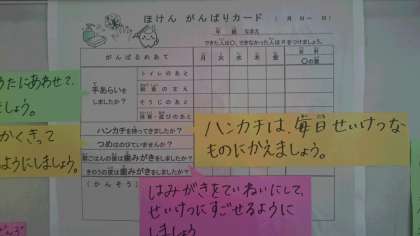 今週は、手洗い・歯みがき週間です。保健委員会が中心となって、休み時間後や給食前、清掃後の手洗いの啓発をしています。そして、保健がんばりカードに記入し、自分自身のふり返りに役立てています。