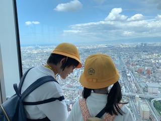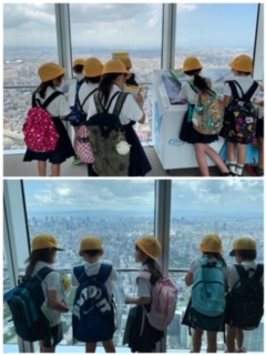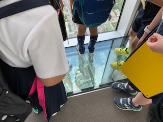 展望スペースでは、班に分かれて活動しています。今日は天気も良く、遠くの方まで見渡せています。また、足元がガラス張りになっているスペースもあります。