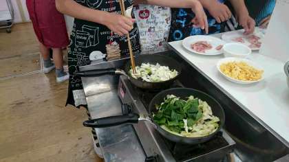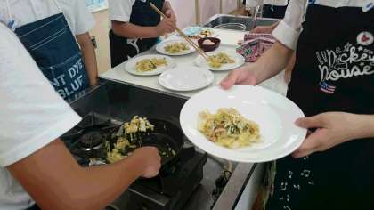 6年生の調理実習の様子です。テーマは「朝ごはんのおかず」です。決められた材料で、班ごとにメニューを考えて作りました。