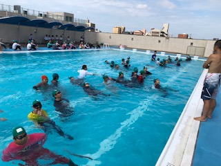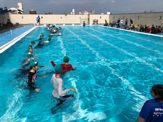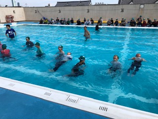服を着た状態で、海や川に落ちてしまった時を想定し、お話を聞いたり実際に体験したりしました。普段の水着だけの時とは違い、服を着たままの状態で水中を動くのはとても難しかったです。ペットボトルを使って浮く練習もしました。