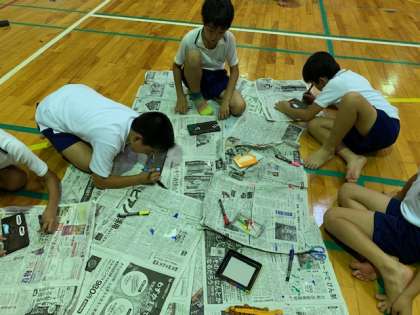 焼き板に、ペンで色をつけていきます。林間での出来事を、想い想いに表しました。