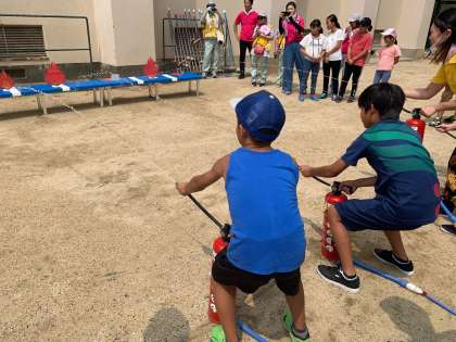 午後からは、消火器の使い方、バケツリレーでの消火方法、毛布を利用した担架の作り方など、役立ち知識をたくさん教えていただきました。