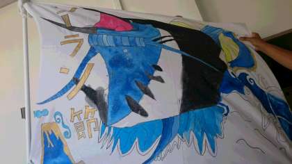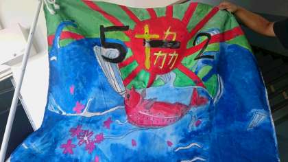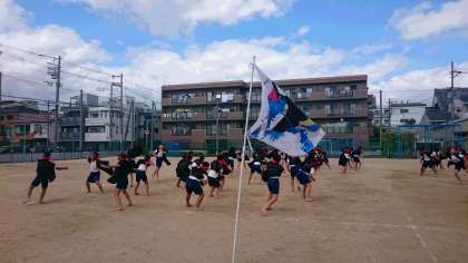 5年生の練習の様子です。今日で練習も最後になりました。クラスごとに作った大漁旗を使って踊りました。