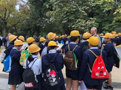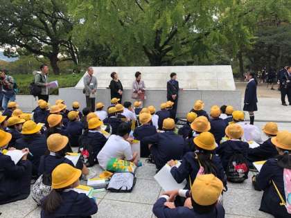 資料館の見学が終わり、ガイドさんに原爆ドームなど公園内を案内していただいています。