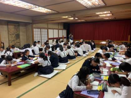 夕食を終えて、平和学習の振り返りをしています。今日の学習で感じたことを、それぞれワークシートに記入しています。一人ひとり真剣に取り組んでいます。